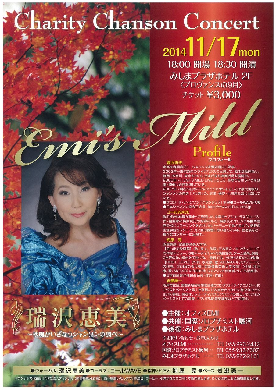 11/17に開催させて頂きます、みしまプラザホテルでの「EMI’S MILD チャリティーシャンソンコンサート」